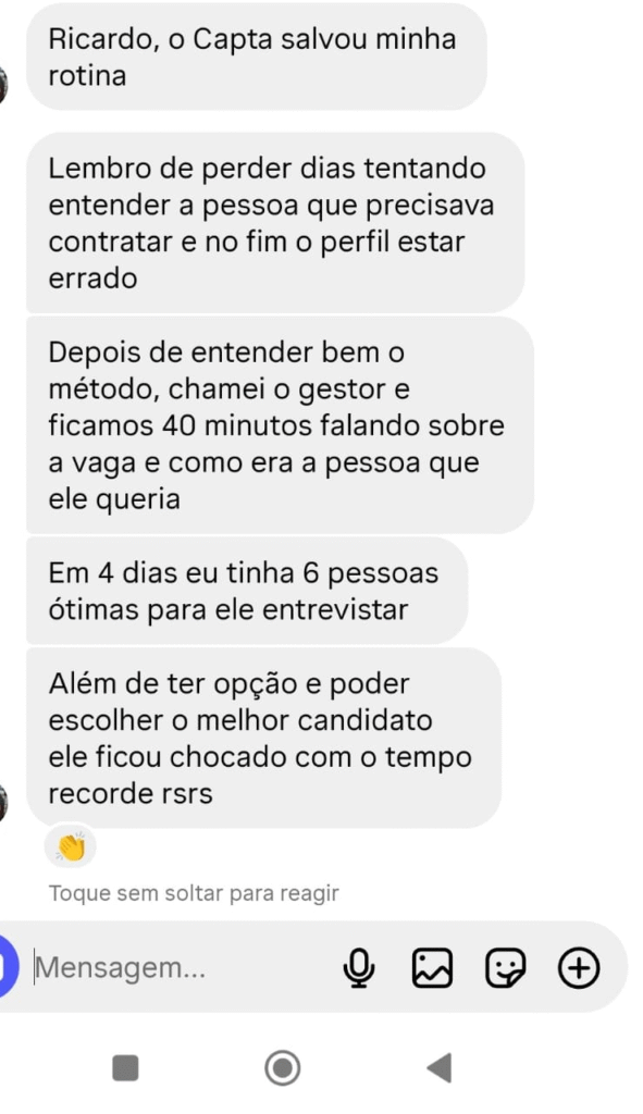 Foi nesse ambiente que eu comecei a desenvolver o que mais tarde se tornaria o Método CAPTA, uma forma estratégica, leve e funcional de contratar.
